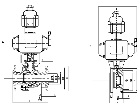 三片式气动球阀: 主要外形尺寸和连接尺寸:QGT611F-25(2.5MPa)、40(4.0MPa)、64(6.4MPa)型气动球阀