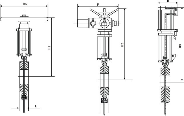 主要外形及连接尺寸: SCZ型穿透式插板阀/长杆平板闸阀