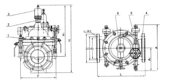 1、球阀2、导阀3、流量调节阀4、主阀5、压力表6、针阀